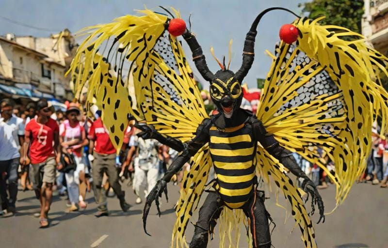 Máscaras contra a covid e repelente contra a dengue, eis a fantasia da ala dos anciãos.