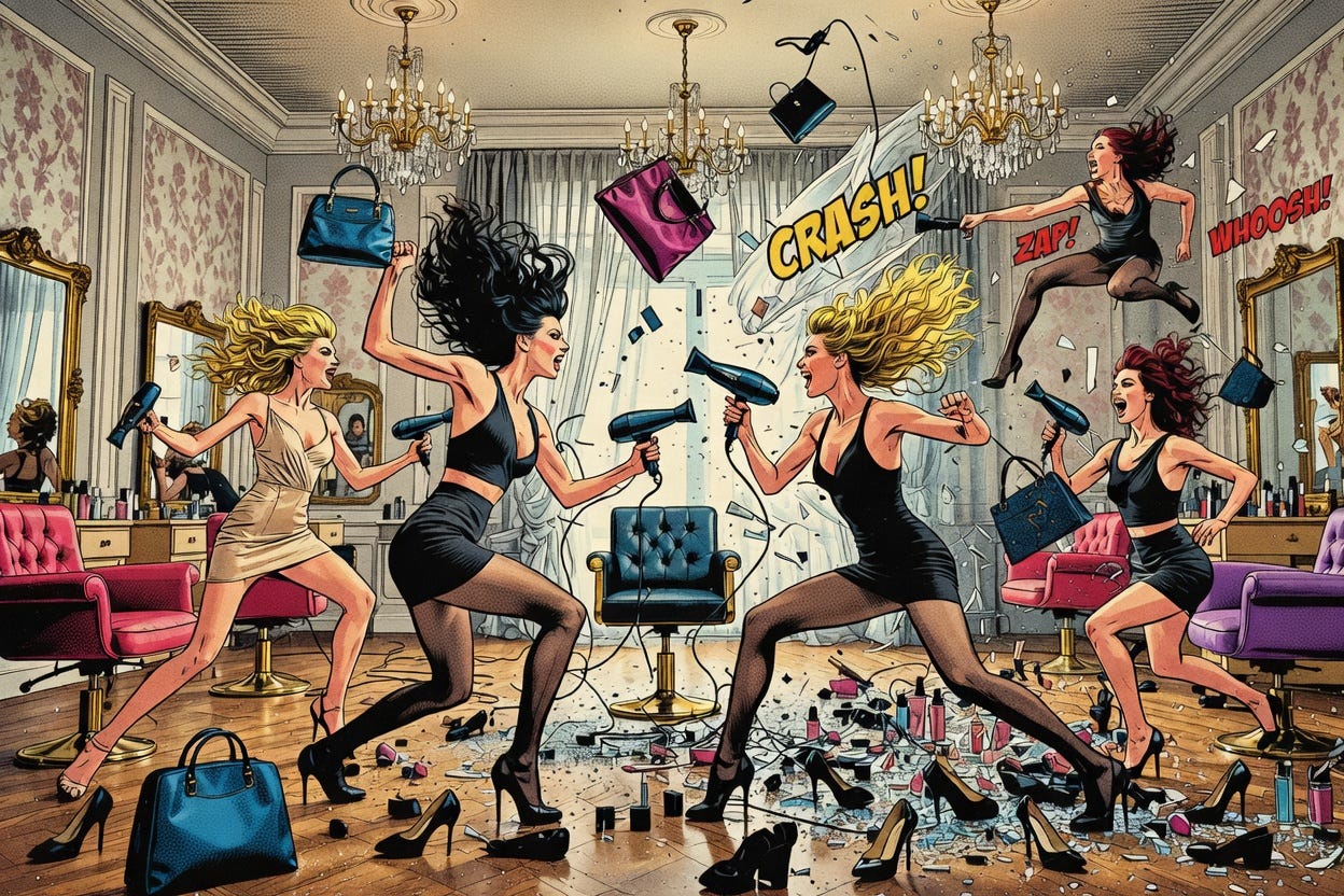 Se tem uma coisa que deixa uma mulher furiosa é chegar num lugar e estar vestindo a mesma roupa que a outra. Tem até uma Lei da Física: duas mulheres não ocupam a mesma liquidação ao mesmo tempo.
