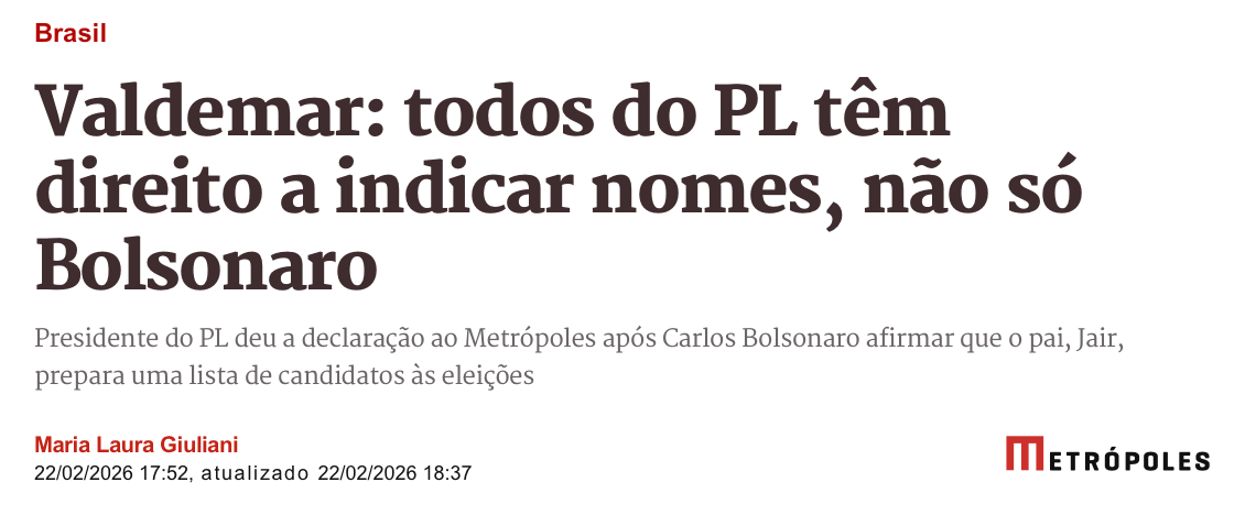 Valdemar, o dono do PL, disse que as coisas não funcionam assim. Explicou que todo mundo no seu partido tem o direito de indicar candidatos – embora só ele tenha o poder de decidir quem vai ter legenda para concorrer nas eleições. É pra isso que server ser dono de partido.