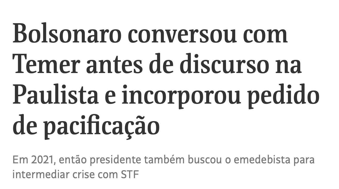 Temer ainda levou recado a alguns ministros do STF. A garantia que o ex-presidente não iria radicalizar no seu discurso na Paulista.