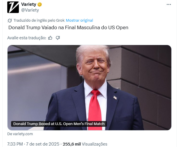 Na final do US Open, Trump foi vaiado por alguns segundos quando apareceu no telão. E a bananice ficou por conta da USTA (Associação de Tênis dos Estados Unidos), que enviou um pedido às emissoras que transmitiriam a final do US Open para que não mostrassem qualquer reação ou perturbação relacionada à presença de Donald Trump no estádio.