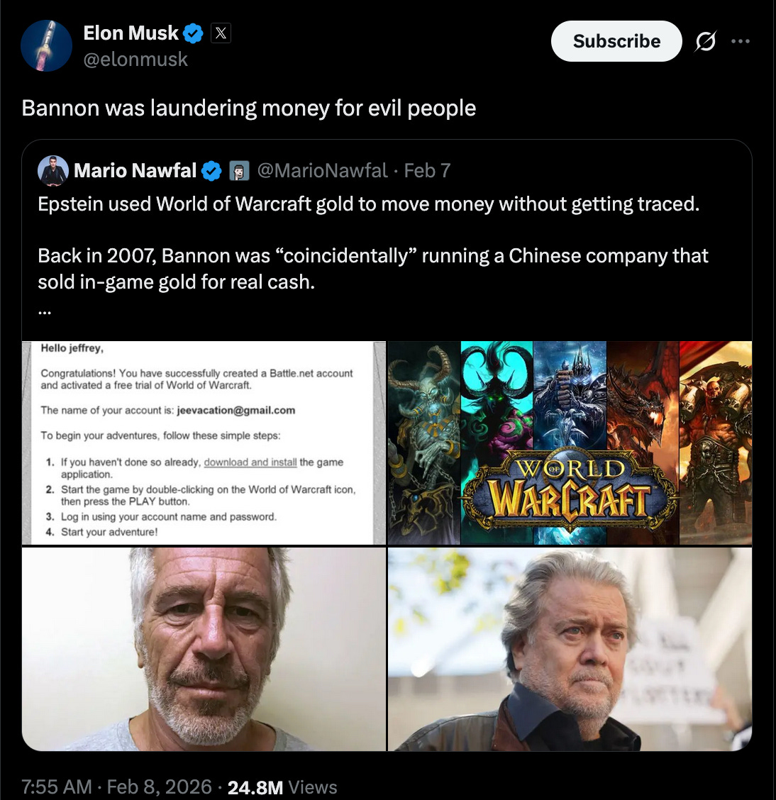 Hoje o Elon Musk retuitou uma teoria levantada no X afirmando que Jeffrey Epstein teria usado o jogo World of Warcraft para escamotear e movimentar dinheiro sem ser rastreado.