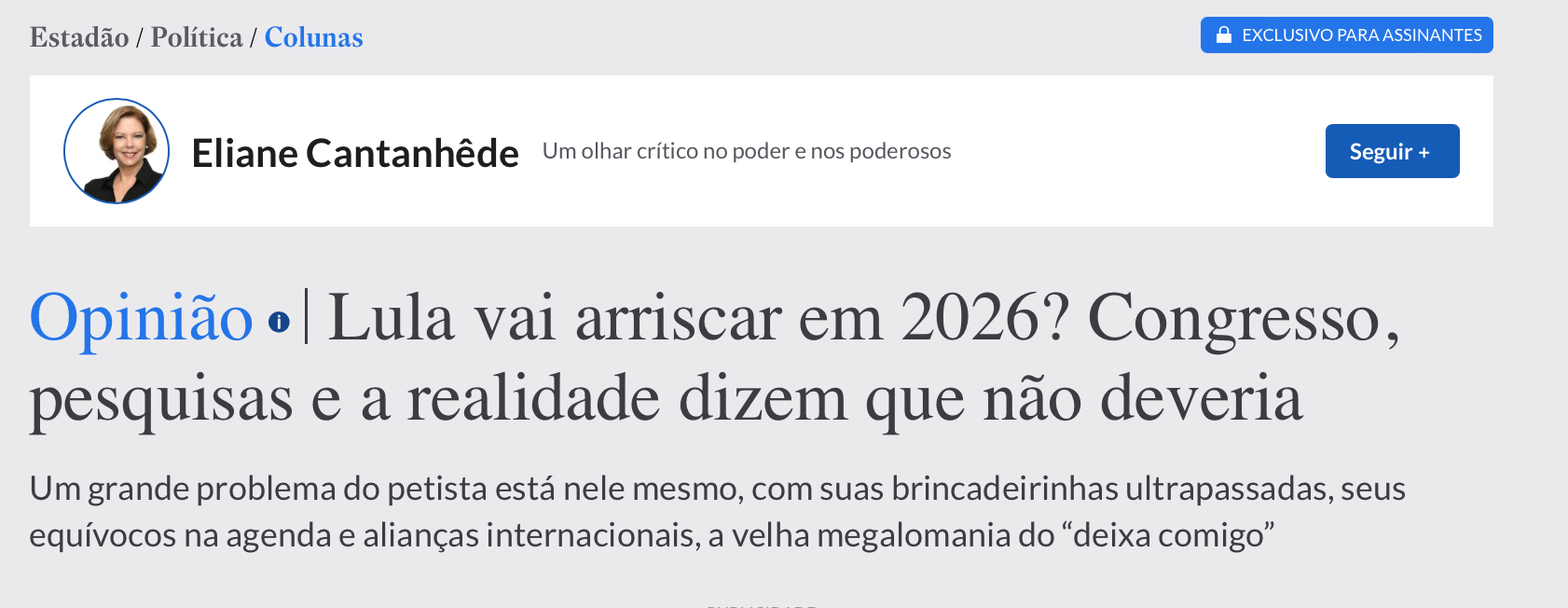Será que Lula vai se arriscar em 2026?, pergunta a Dona Benta do jornalismo brasileiro.