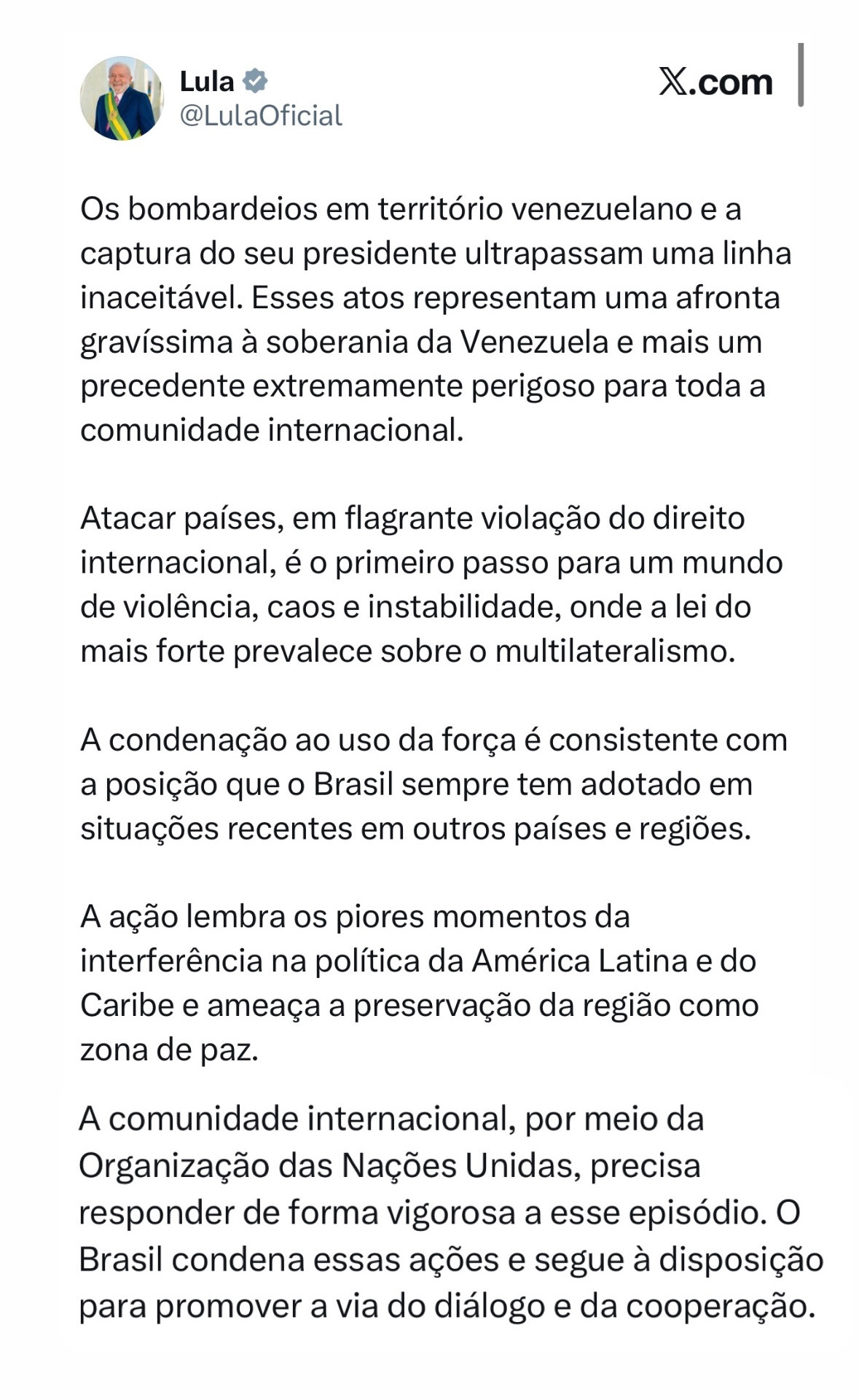 Se os próprios venezuelanos estão comemorando a queda e prisão de Maduro, um presidente brasileiro se meter na alegria de um povo soberano não seria também um presidente passando da linha do aceitável?