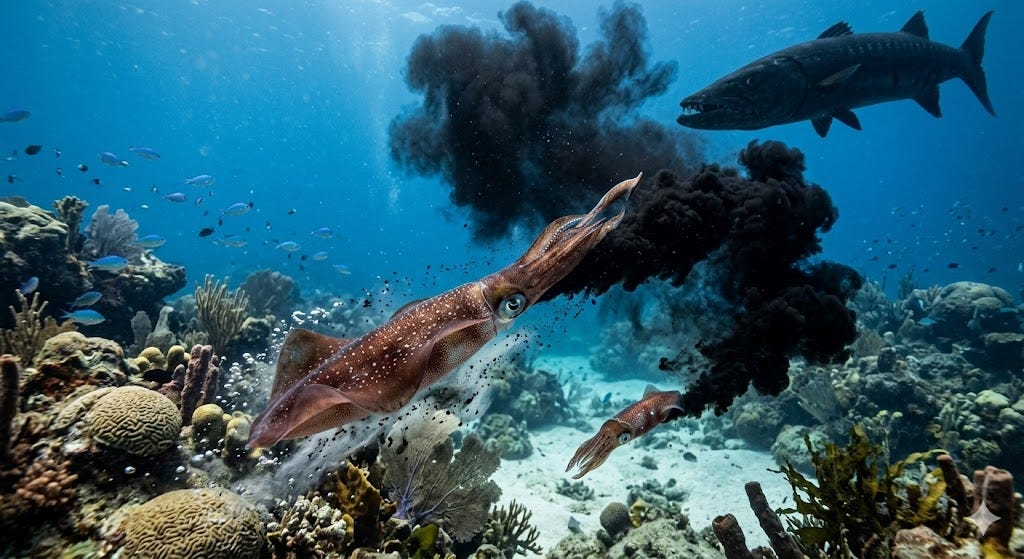 As lulas, quando ameaçadas, costumam lançar uma tinta preta para se esconder e fugir.