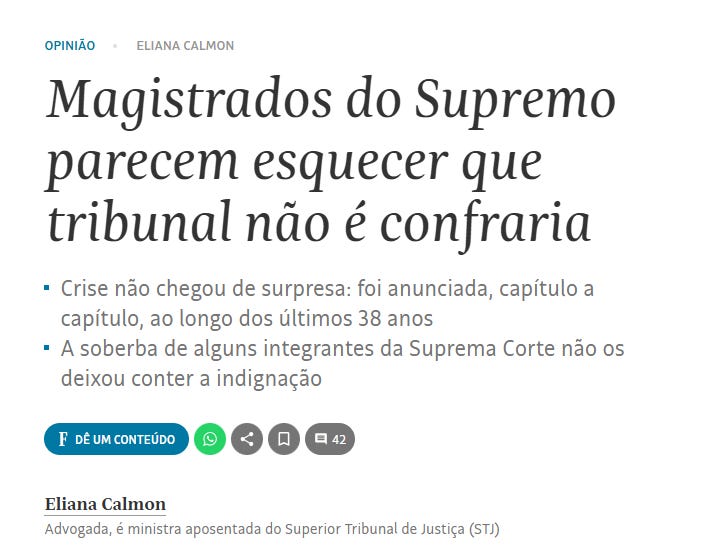 Enquanto certas vozes da magistratura perdem-se em queixas sobre a extinção de penduricalhos, fazendo uma vexaminosa comparação entre a perda de privilégios e um regime de escravidão, a ministra aposentada do STJ Eliana Calmon mostra como é ter senso de prioridade e de integridade institucional. Em vez de se entrincheirar na medíocre defesa do próprio contracheque, ou alimentar aquele costumeiro silêncio covarde, ela resolveu dar nome aos bois.
