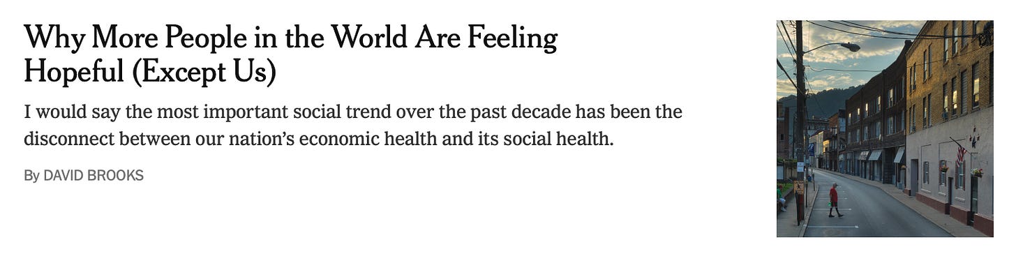 No último dia 7, o historiador e colunista de opinião do The New York Times David Brooks publicou um artigo cuja ideia de fundo não é nova, mas, como sói acontecer, é dessas repetições que são sempre necessárias. Repercutindo uma recente pesquisa do instituto Gallup, realizada em 142 países, Brooks expõe duas tendências mundiais em termos da autopercepção que as pessoas têm sobre suas próprias vidas. O número de pessoas que sentem que suas vidas são boas e se sentem realizadas cresceu, em média, sobretudo em países pobres. Apenas 7% da população estudada afirma estar passando por sofrimento profundo; é o menor índice desde 2007. No entanto, o mesmo estudo aponta um outro dado importante. Nos países mais desenvolvidos, especialmente na Europa e na América do Norte, o número de pessoas que afirmam estar florescendo ou prosperando em suas vidas caiu de 67%, em 2007, para 49%.