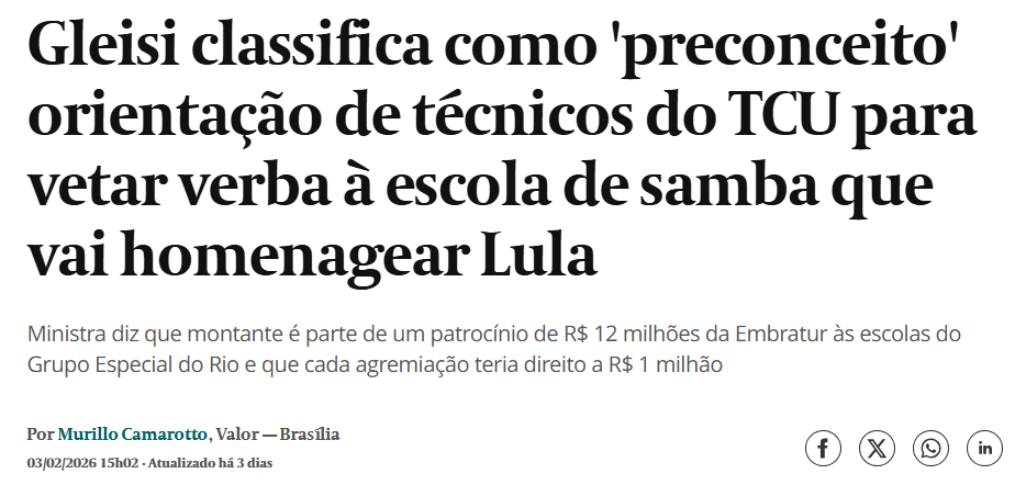 Dizem que Sidônio proibiu, o jurídico desaconselhou, mas Janja insistiu em sair sambando na cara de todo mundo. Ela até já soltou notinhas por aí dizendo que ela não ocupa cargo público nem nada. Afinal, já que não querem contratá-la para exercer a função pública de primeira Lula, ela pode fazer o que bem entende. E vai sambar e andar na avenida o quanto ela quiser. Janja não é uma autoridade com responsabilidades políticas nem precisa se expor menos, ela pode expor tudo. Nada mais justo e abominável, ou melhor, admirável que ela saia de Rainha da Bateria!!