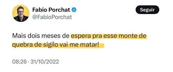 O guerreirão da democracia Fábio Porchat, aquele homem de geléia que retirou o seu apoio ao Léo Lins porque a Beautiful People ordenou e que na minha condenação correu montar um tribunal de exceção na TV com o Emicida e outros lacaios do petismo para celebrar e apoiar a minha prisão, sempre ostentou uma indignação de valentona contra os sigilos de gastos do Bolsonaro. Era uma sensibilidade moral de dar inveja a freira mais pura do convento.