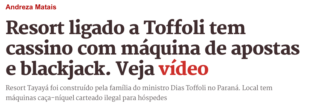Dias Toffoli também foi flagrado pelo “padrão criminoso da imprensa” quando recebia banqueiros na intimidade do seu Tayáyá, com mesas de cassinos e, suponho, degustações intensas de charutos e vinhos caros.