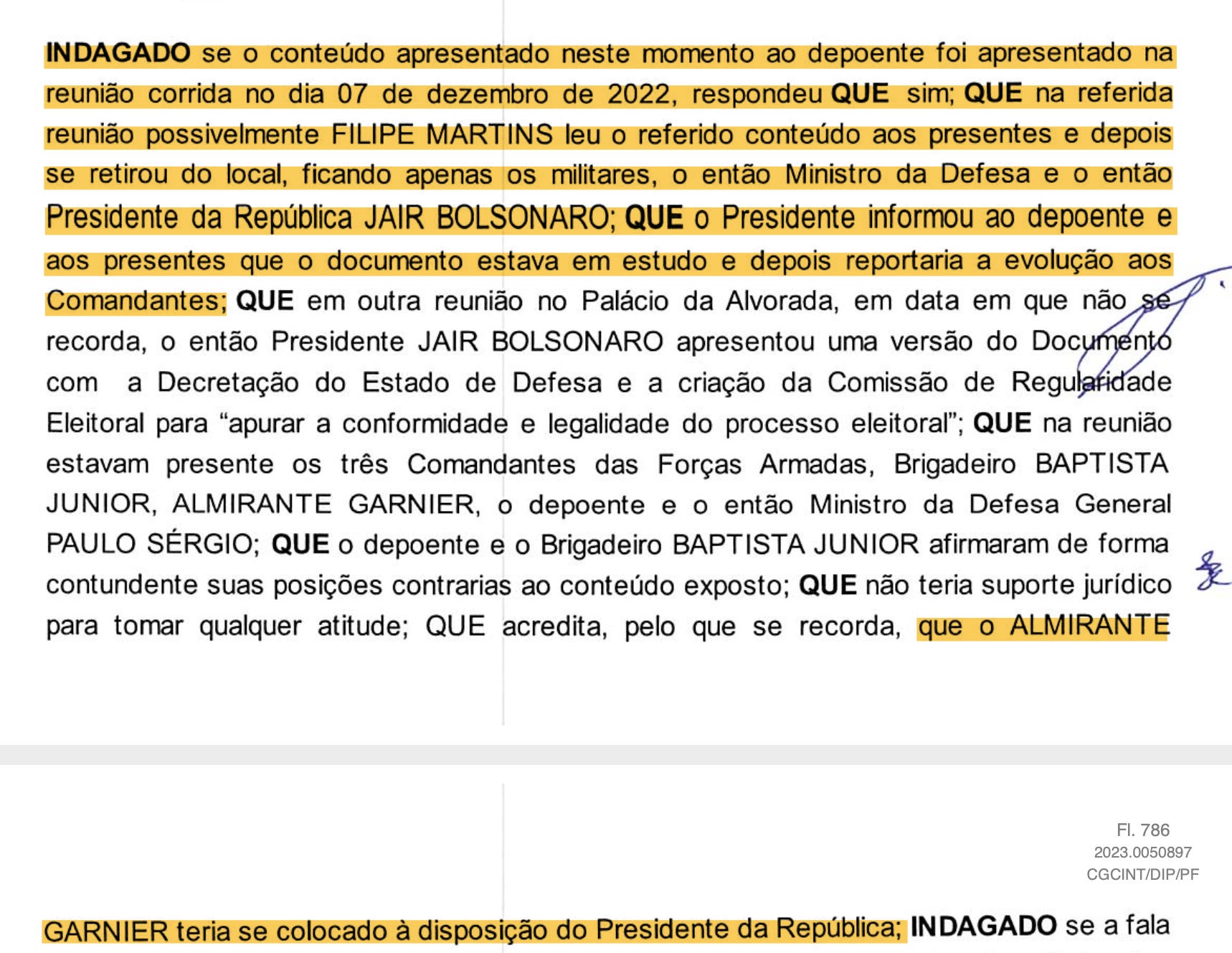 Freire Gomes confirma que Filipe Martins apresentou a minuta, leu um texto enfadonho, cheio de jargões jurídicos, e saiu de cena. A partir dali, o protagonismo foi todo de Bolsonaro.