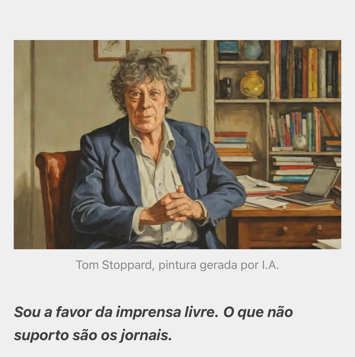 O jornal La Repubblica, hoje, trata da queda vertical do número de espectadores dos telejornais italianos. O público cansou de ser manipulado pelo jornalismo malandro, que camufla o próprio sectarismo. Isso tem a ver conosco. Não sei se o site vai conseguir crescer. Mas não tenho a menor dúvida de que o caminho está certo, aquele indicado por Tom Stoppard: “sou a favor da imprensa livre, o que não suporto são os jornais”.