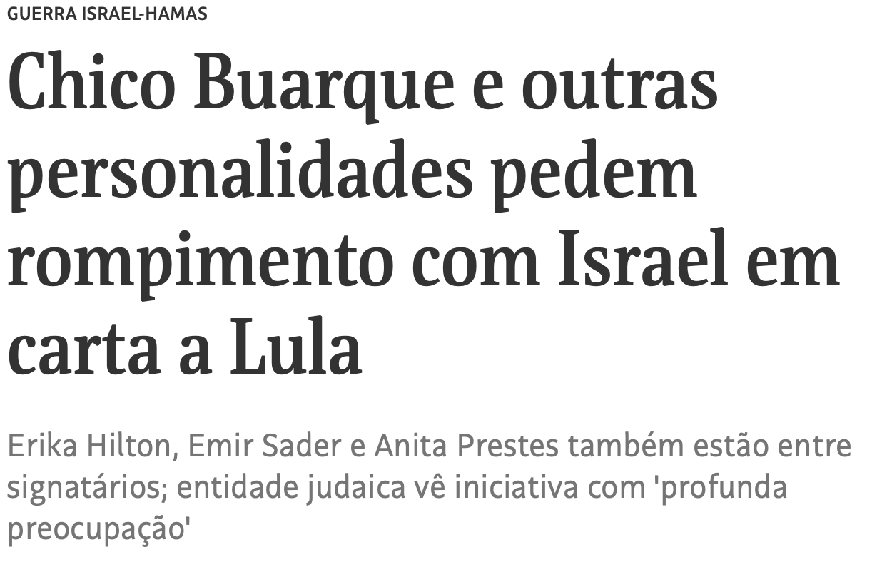 “Chico Buarque e outras personalidades” querem “sanções ao regime israelense, rompendo relações diplomáticas e comerciais com o estado sionista de Israel, através de embargo militar bilateral e embargo energético, e revogue o tratado de livre comércio em vigor”.