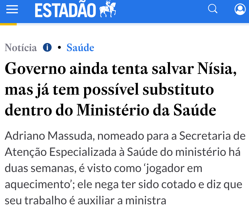 A matéria do Estadão é um tanto irônica. Diz que o “governo ainda tenta salvar Nísia”, mas – e sempre tem um mas – já tem um substituto para ela.