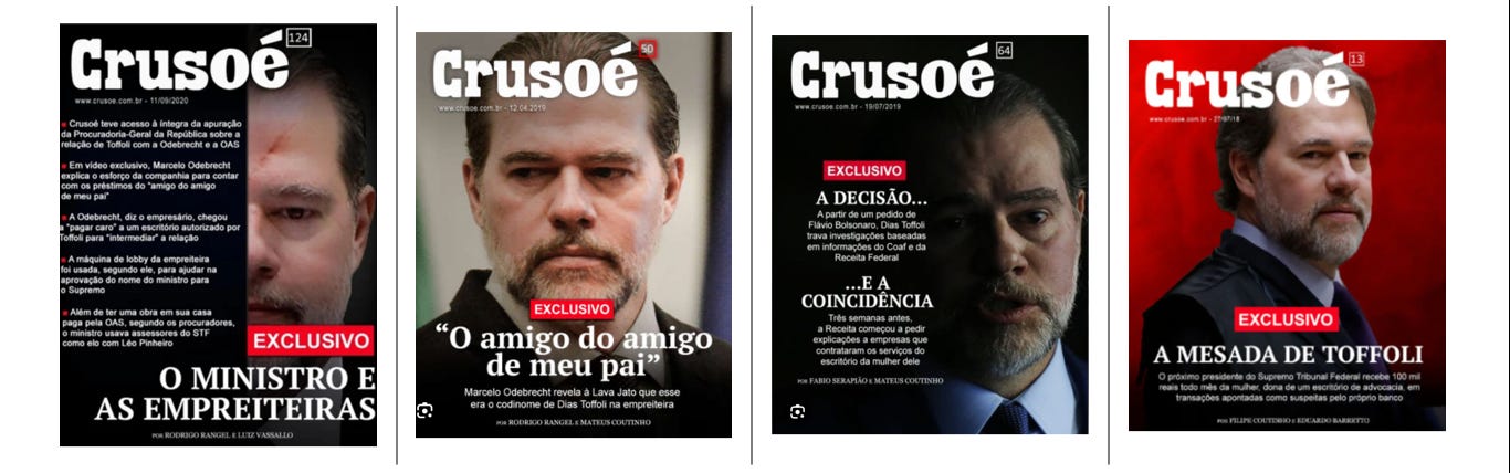 Como já publicamos aqui, Diogo Mainardi relembrou todas as capas que a Revista Crusoé dedicou a Toffoli: