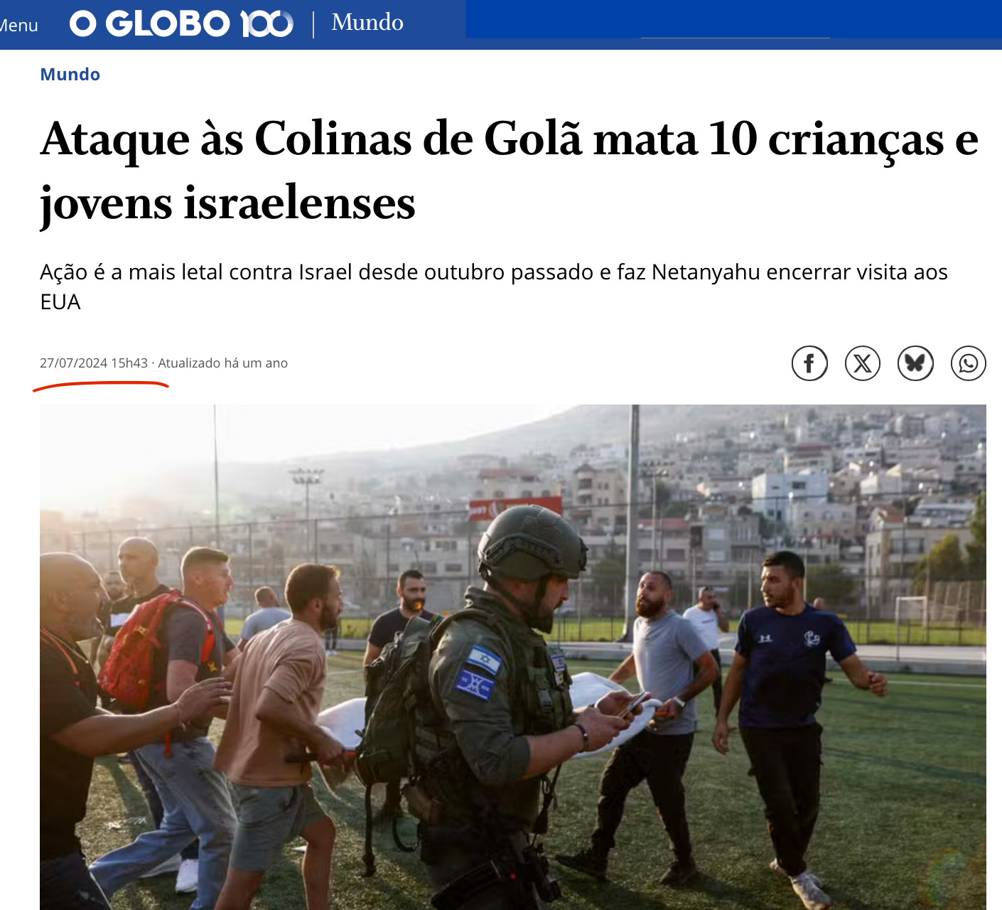Em julho de 2024, o Hezbollah disparou um míssel numa cidade israelense de Majdal Shamsna, na fronteira com o Líbano, onde vive uma comunidade drusa (minoria étnico-religiosa árabe-muçulmana). A explosão ocorreu num campo de futebol de uma escola e matou 12 crianças – nove meninos e três meninas – e também deixou diversos feridos.