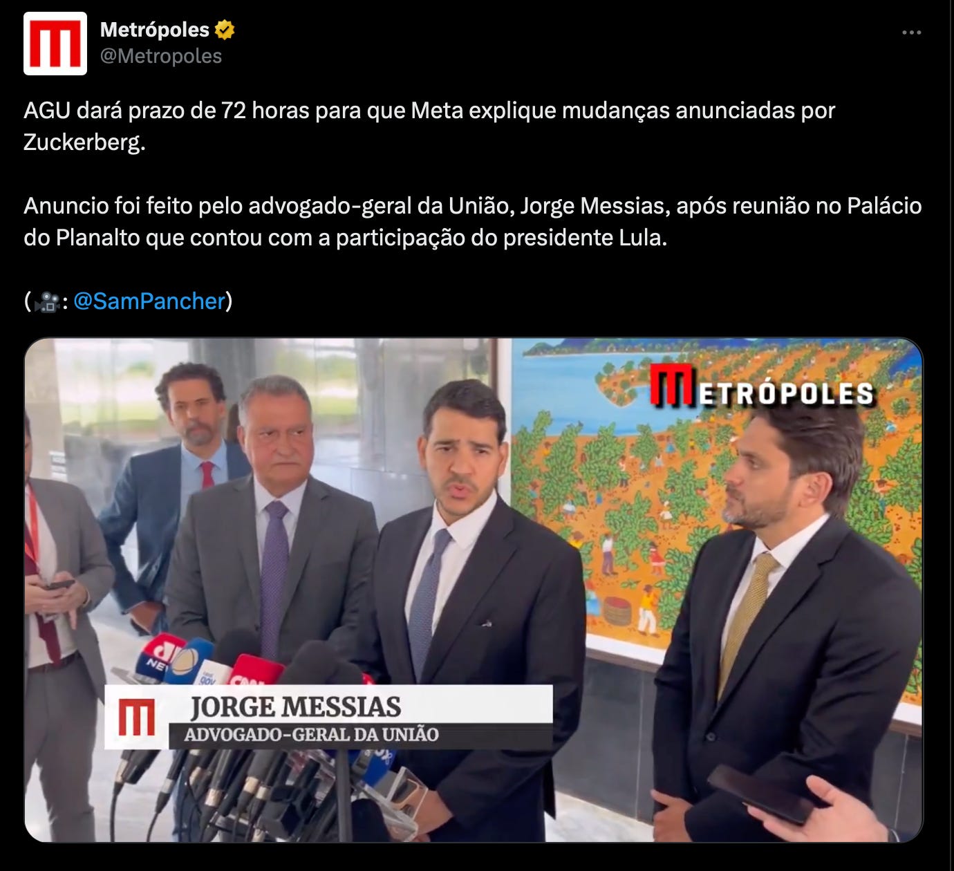 Junto com um papel, Bessias anunciou que vai notificar extrajudicialmente a Meta para que venha a público em, no máximo, 72 horas, a fim de esclarecer os motivos de se acabar com o monopólio da indústria de checadores de fatos a favor do petismo, para adotar as notas da comunidade.