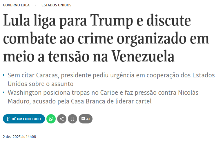 O diálogo, dizem as fontes oficiais, além das tarifas, tratou sobre uma parceria proposta por Lula contra o crime organizado. O governo que passou anos desprezando a segurança pública agora pede socorro ao imperialismo.