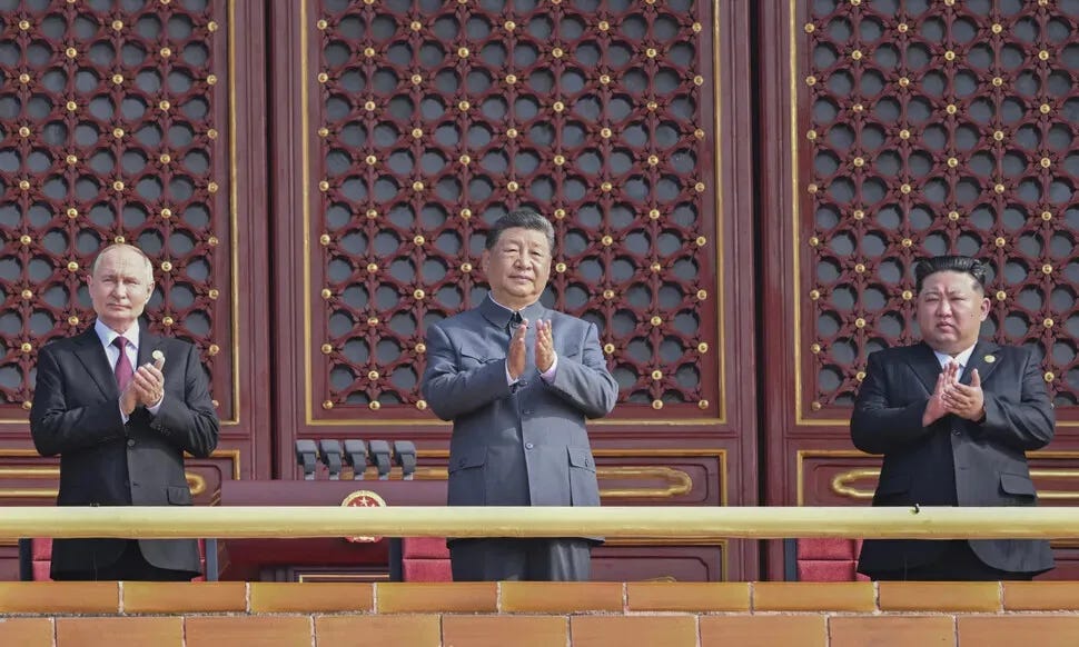 Putin, Xi Jinping e Kim Jong-un caminhavam com seus entourages rumo à praça Tiamannen, na China, mais conhecida como Praça da Paz Celestial, da famosa foto do estudante parando uma fila de tanques de guerra no peito, depois do massacre ocorrido em 1989.