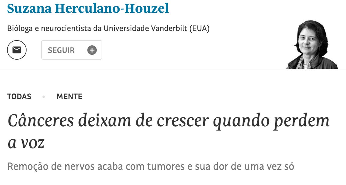 O artigo é interessante. Nele, a autora descreve a descoberta científica de como nervos sensoriais alimentam o crescimento tumoral. No plano científico, é metáfora para traduzir o dado de um processo natural: nervos funcionando como microfones e autofalantes, tumores que ganham “voz” e precisam ser silenciados. Até aí, tudo aparentemente bem.