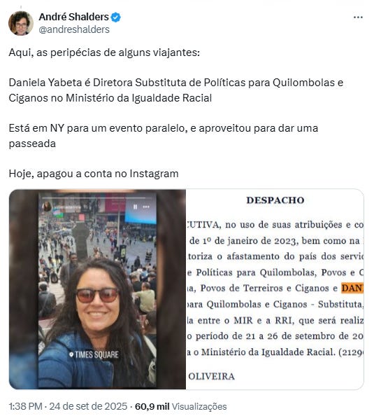A rigor, mim quer entender por que uma diretora SUBSTITUTA de políticas para quilombolas e ciganos precisa ir a Manhattan para discutir justiça climática.