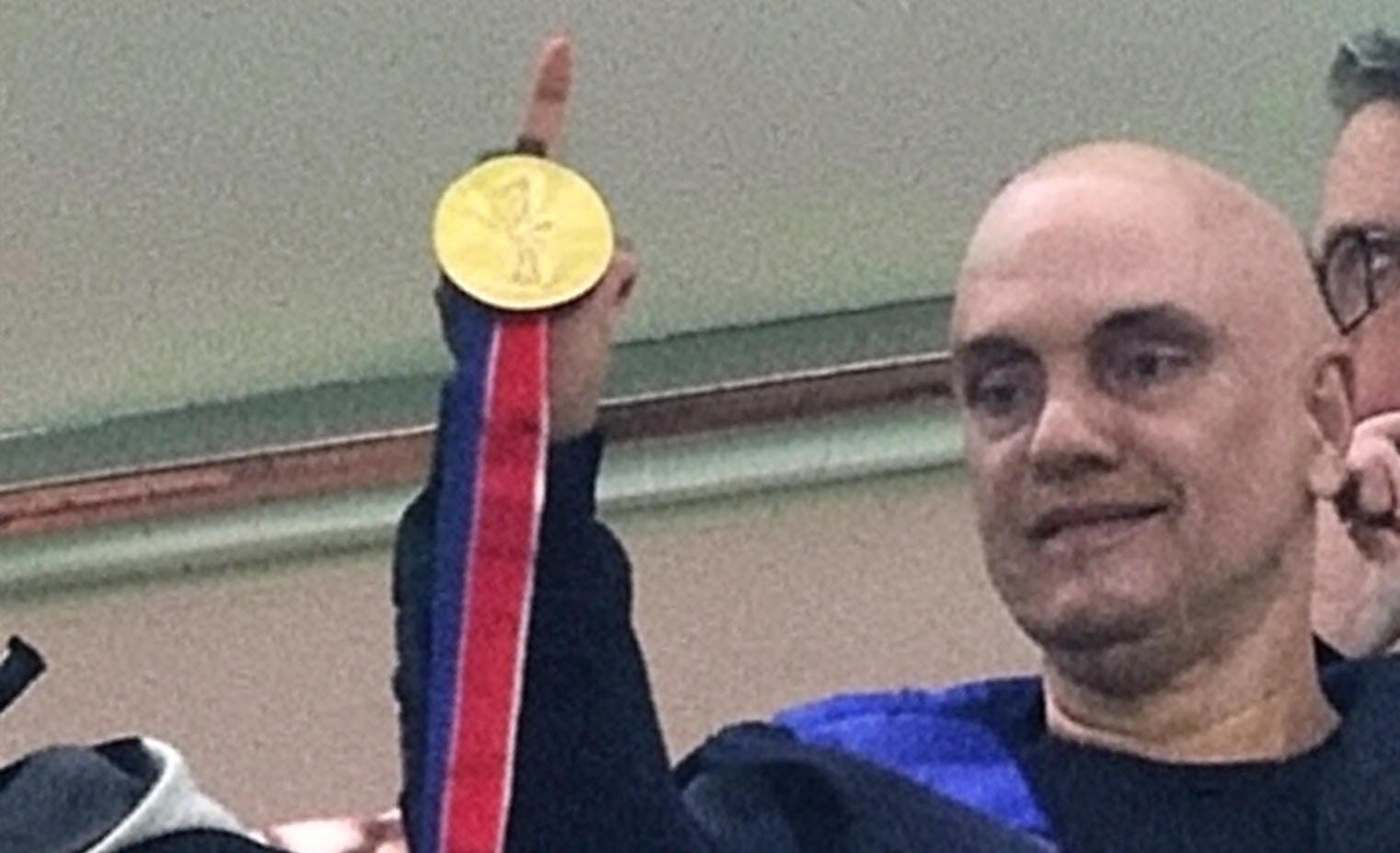 Tá bom, vai... A culpa é dele também por ter aceito a medalhoca. Ou talvez ele tenha TOC e precisava equilibrar o dedo do meio com a outra mão em outro evento público.