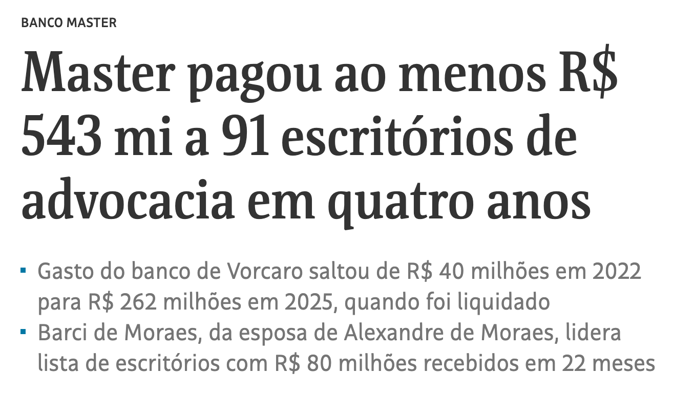 Entre 2022 e 2025, o Banco Master destinou mais de meio bilhão de reais a escritórios de advocacia, distribuídos entre dezenas de bancas pelo país. O banco vivia no vermelho, mas deixou muita gente no azul.