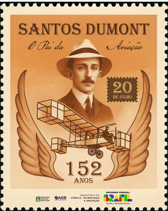 Tão sintomático. Lula sai por aí com sua voz cada dia mais prejudicada, assassinando a concordância gramatical e estufando o peito de tanta soberania, fingindo um protagonismo internacional que não tem. No ápice desse momento, a Agência Espacial Brasileira lança um selo comemorativo dos 152 anos de Santos Dumont.