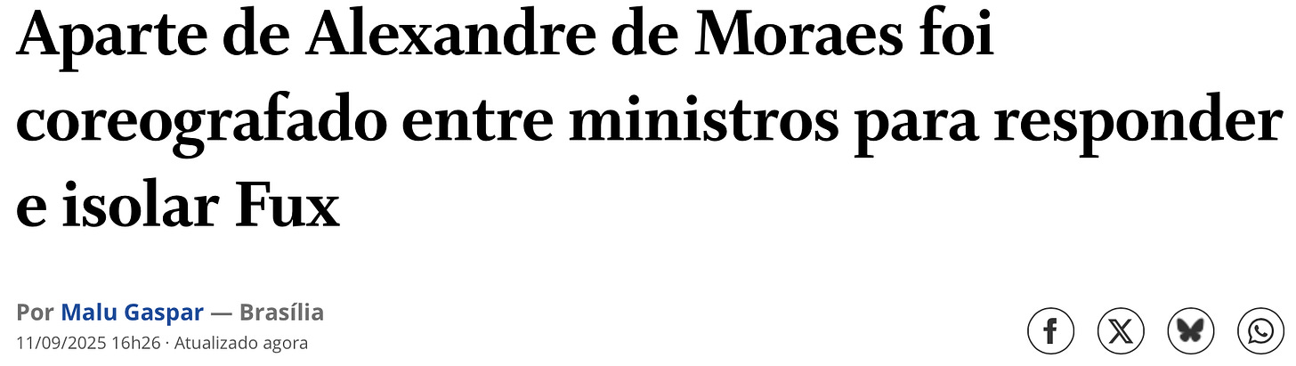 Como tudo no Brasil vira jogo de cena, segundo a coluna da Malu Gaspar, no Globo, os ministríssimos coreografaram a sessão de ontem para “isolar Luiz Fux”, o ministro que ousou sair do script para fazer seu showzinho particular.