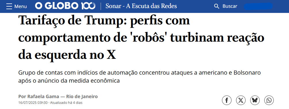 O Globo mapeou perfis automatizados – alguns com menos de 200 seguidores e postando até 27 vezes por minuto – que fizeram pelo menos um terço dos 1,6 milhão de publicações que atacaram Bolsonaro pelo tarifaço de Trump.