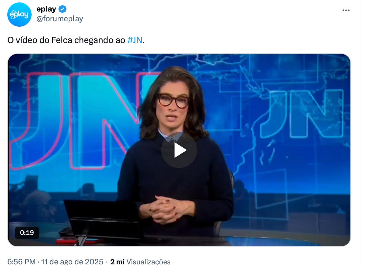 Só uma observação: O vídeo no começo do post seria uma ironia/piada sobre a suspensão do X. Teve uma onda de conteúdo irônico quando isso aconteceu. Acho difícil afirmar com toda certeza que ele agiu alinhado aos interesses do governo (embora o timing de fato seja questionável), porque essa não é a primeira crise ou situação que o governo utiliza para tentar emplacar regulamentação de redes sociais só esse ano.