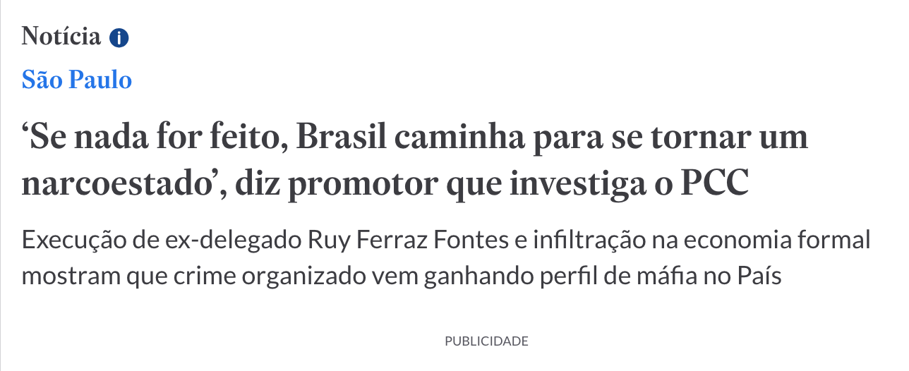 Eu discordo. O Brasil já é um narcoestado há muito tempo. A prova é o próprio promotor Lincoln Gakiya, que combate o PCC há mais de 20 anos, mas vê seu trabalho ser inutilizado por uma política cada vez mais permissiva com a lavagem de dinheiro e o tráfico de drogas que, sejamos sinceros, só sobrevive por conta do aumento do consumo.