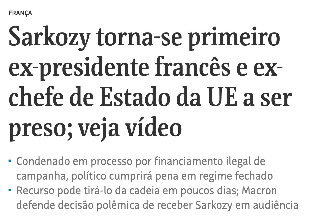 Sarkozy não teve a mesma sorte. A Justiça francesa não excluiu a denúncia e o condenou a 5 anos de prisão.