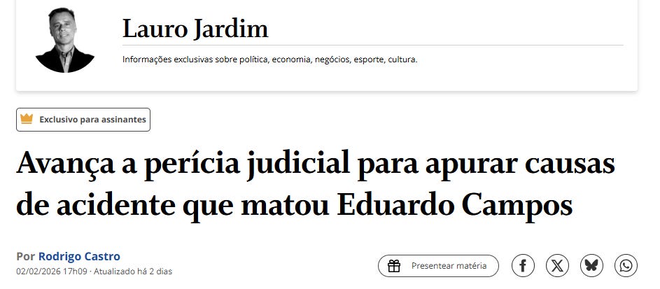 É curioso como o Brasil rapidamente esquece ou deixa resfriar acontecimentos tão graves e tão mal explicados. Com um laudo inconcluso da Polícia Federal e uma perícia do Centro de Investigação e Prevenção de Acidentes Aeronáuticos (Cenipa) – que, aparentemente, devia ser considerada absolutamente incontestável – a mãe e o irmão de Eduardo Campos insistem há anos em saber as causas reais do acidente.