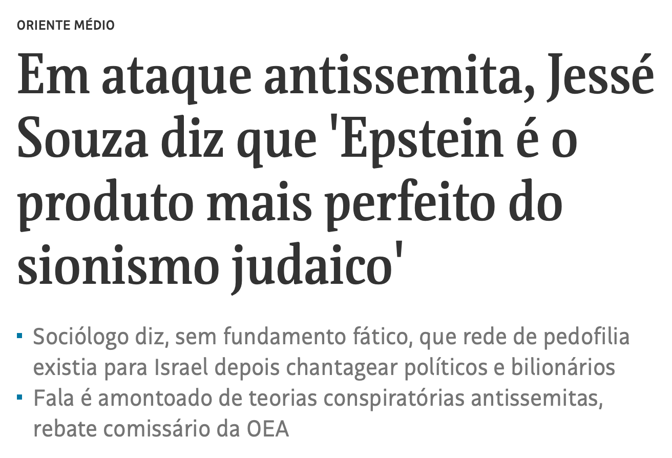 Na lógica de Jessé de Souza, se Jeffrey Epstein é judeu, logo os judeus são culpados pelos crimes de Epstein.