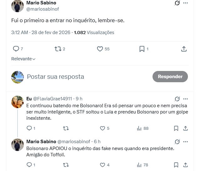 Lembrar que foi a primeira vítima do inquérito que foi aberto com todo o apoio de Bolsonaro não resolve, porque os sentidos atrofiados não permitem que essa realidade adentre o telencéfalo do seguidor de político.