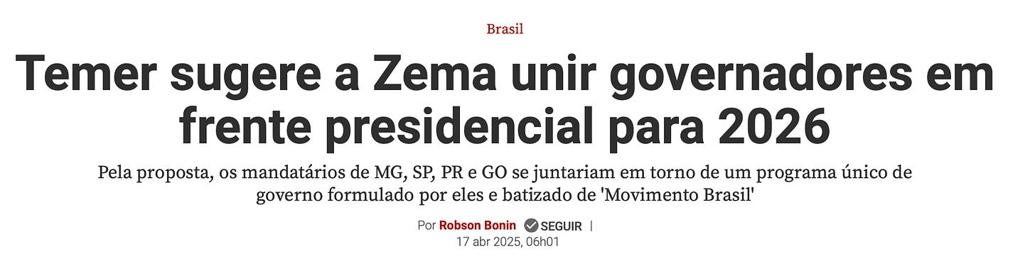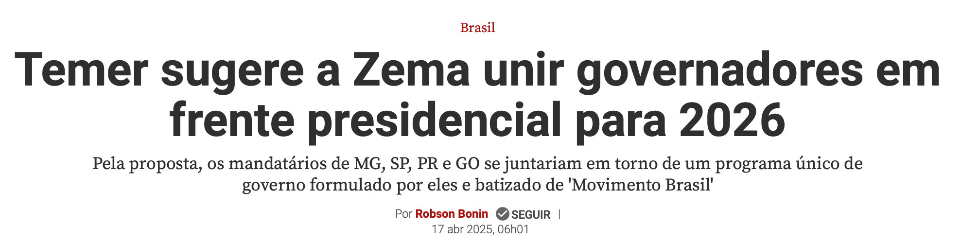Se Zema saiu contente e saltitante do encontro, quer dizer que ele também aderiu à proposta do Poderoso Chefão do Centrão, que já batizou o nome da aliança dos 5 governadores como “Movimento Brasil”.