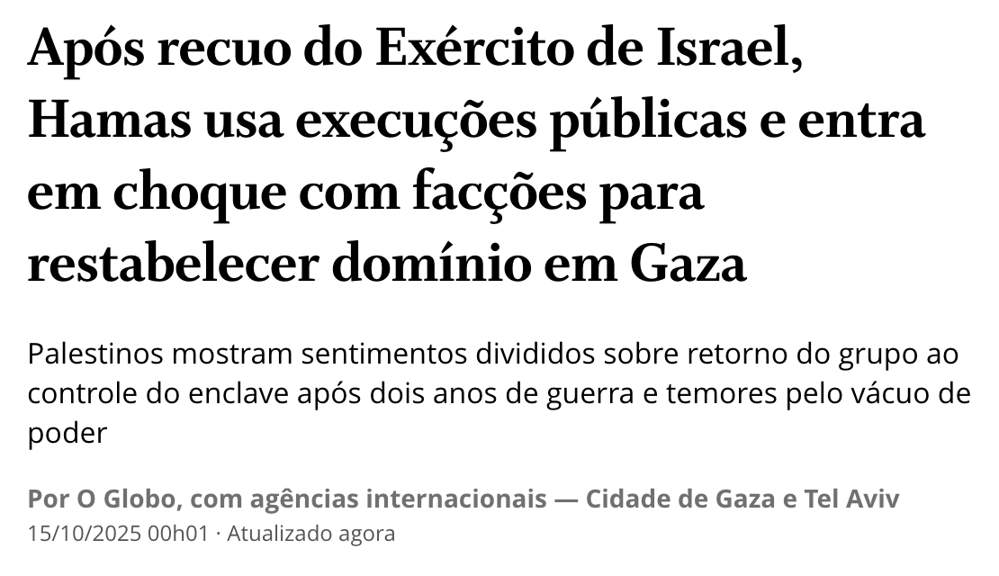 Ainda tem muita gente morrendo em Gaza, mas são acertos de contas entre o Hamas e os palestinos que não gostavam do Hamas. Eram poucos, a maioria gostava, aplaudia, eles festejaram o ataque de 7 de outubro e receberam os reféns israelenses com paus e pedras.