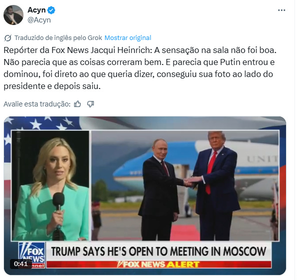 Sobre o encontro de Trump e Putin no Alasca. Se a jornalista da Fox News disse que Putin passou como um rolo compressor por cima de Trump, quem somos nós para negar?