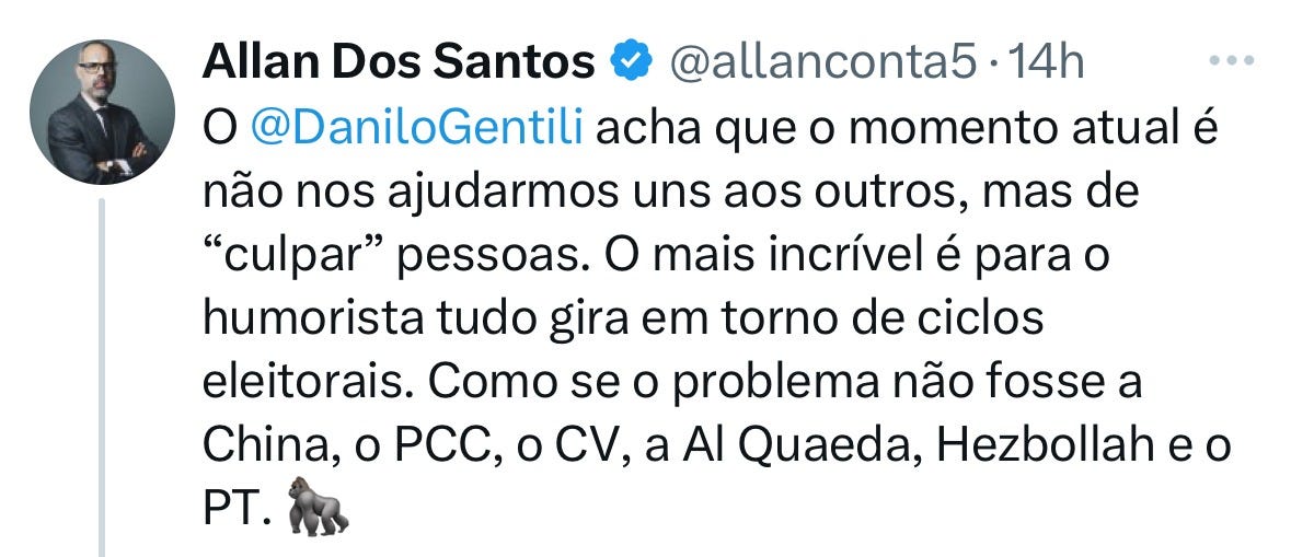 Na patética tentativa de sair das sombras da irrelevância, que é onde todo lacaio de déspota caído se refugia, Allan dos Santos tentou surfar no hype do dia e relinchou contra o meu vídeo de apoio ao Léo Lins.