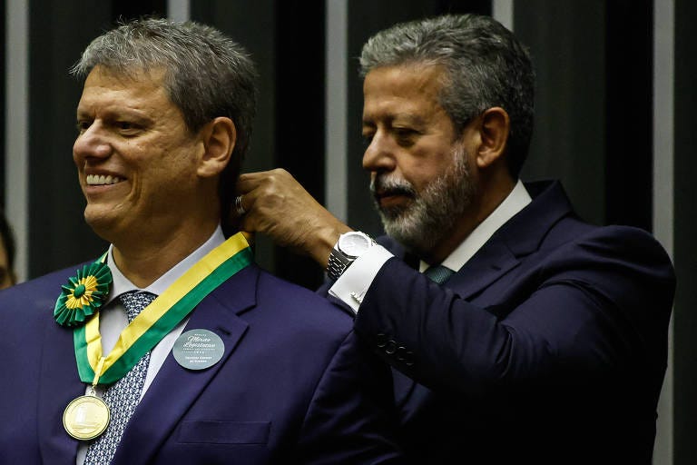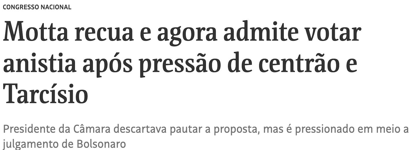 Embora a manchete fale em “pressão de Tarcísio”, o texto da reportagem diz que “o governador de São Paulo passou o dia em Brasília (…) e conversou brevemente com Motta por telefone nesta terça, mas que poderia haver um encontro mais tarde".