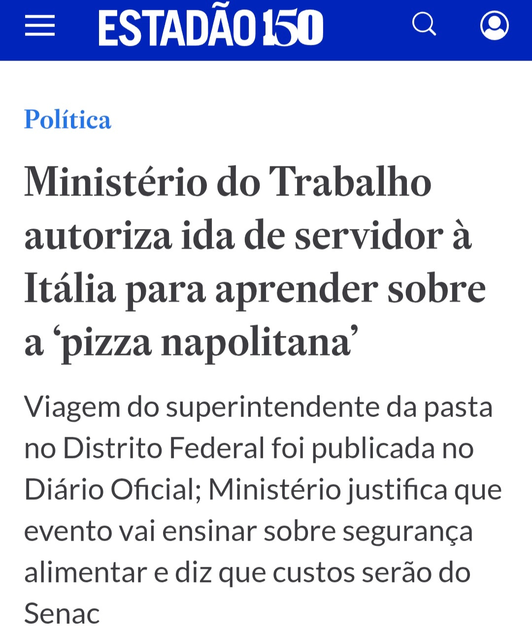 Mas a notícia mais importante da semana foi a do Ministério do Trabalho ter autorizado um funcionário a se ausentar para aprender a fazer pizza na Itália.