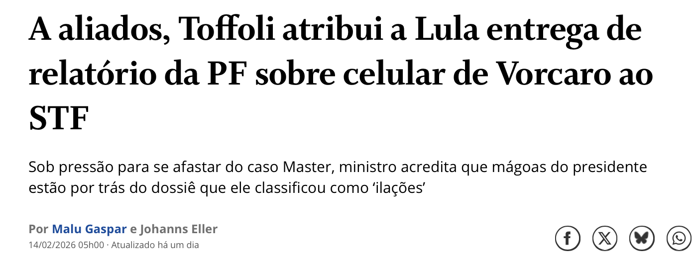 Toffoli está desconfiado de que Lula está por trás do relatório da PF que lhe tirou a relatoria do processo do Banco Master.