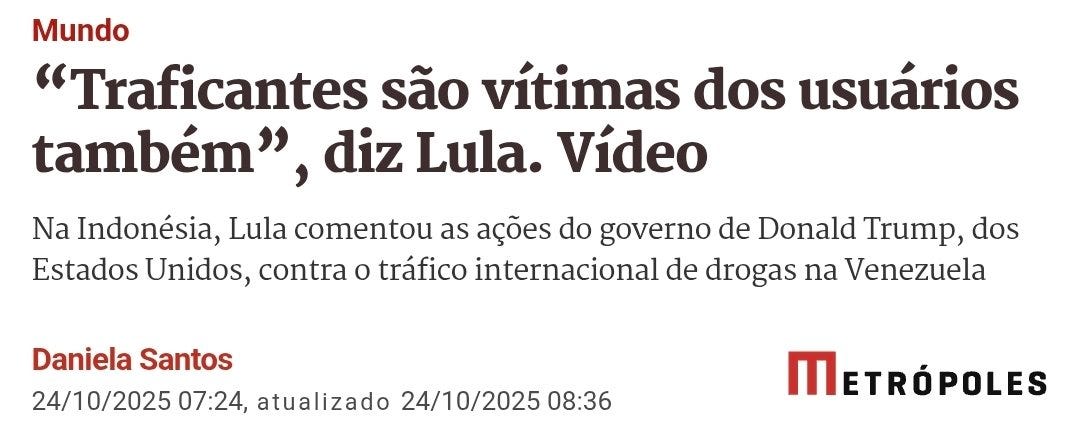 Lula fala de vítimas, mas nunca lembra das reais: as famílias destruídas pelas drogas, os pais que enterram filhos, as mães que choram por causa de um homicídio, ou o trabalhador que agoniza por causa de um assalto. Nunca vimos Lula — ou essa raça de canalhas — defender essas pessoas em assembleias mundo afora. No Brasil do “coitadismo”, o criminoso ganha escudo do presidente e o trabalhador ganha bala perdida na cabeça.