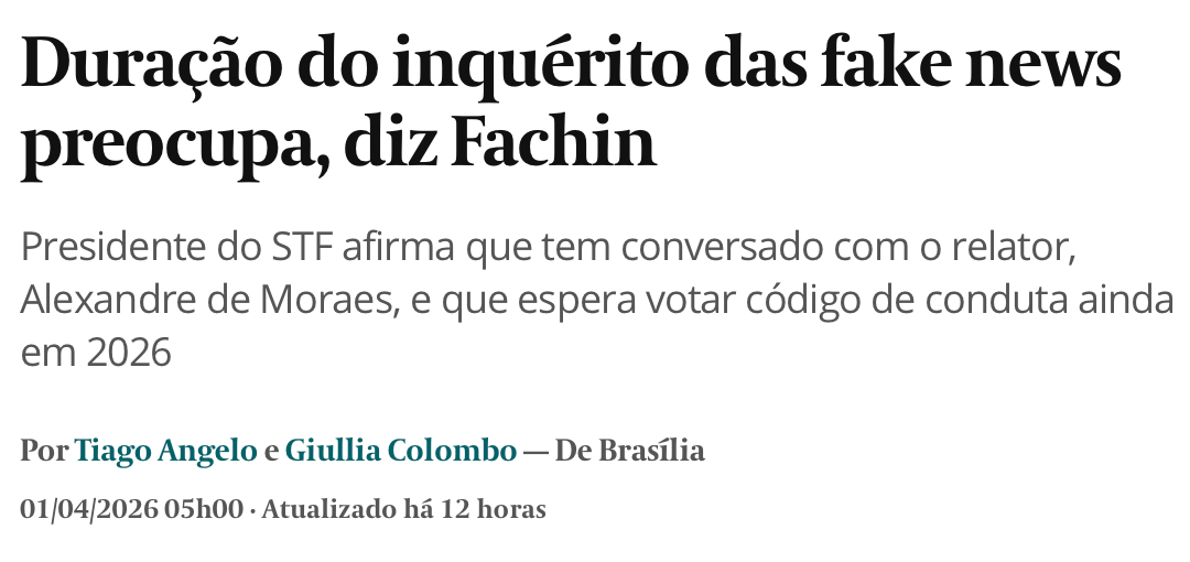 O supremíssimo supremo Edson Fachin, afirmou que a duração do inquérito das fake news gera preocupação