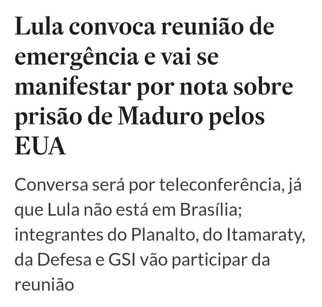 #Tchau,QueridoMaduro capturado: um ditador a menosNão é Redaçãojan 03, 2026106142CompartilharGoverno brasileiro convocou uma reunião de emergência. Mas será online. Lula não vai estragar as férias da Janja por causa do Maduro.Putin, o psicopata carniceiro do Kremlin pede diálogo.Feliz Ano Novo, América Latina. ASSINE o Não é Imprensa e ajude a manter e ampliar este trabalho.Inscreva-seAnteriorPróximo