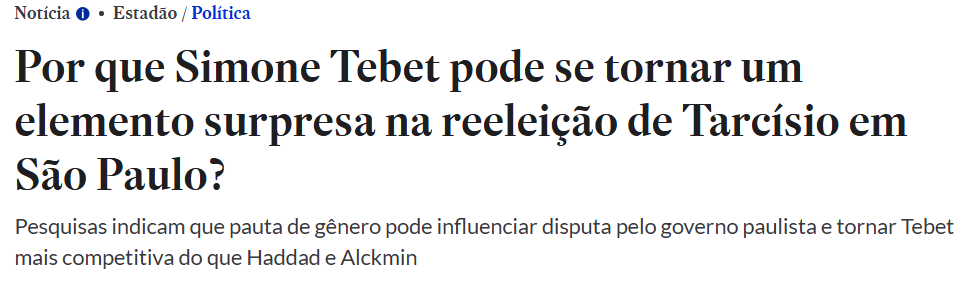 Em reportagem do Estadão, Tebet é desenhada como ferramenta estratégica de Lula para tentar desbancar Tarcísio. A manipulação passa pela instrumentalização do discurso de que São Paulo nunca teve uma governadora como isca para atrair eleitoras que hoje apoiam Tarcísio, mas que seriam sensíveis a uma mulher como candidata.