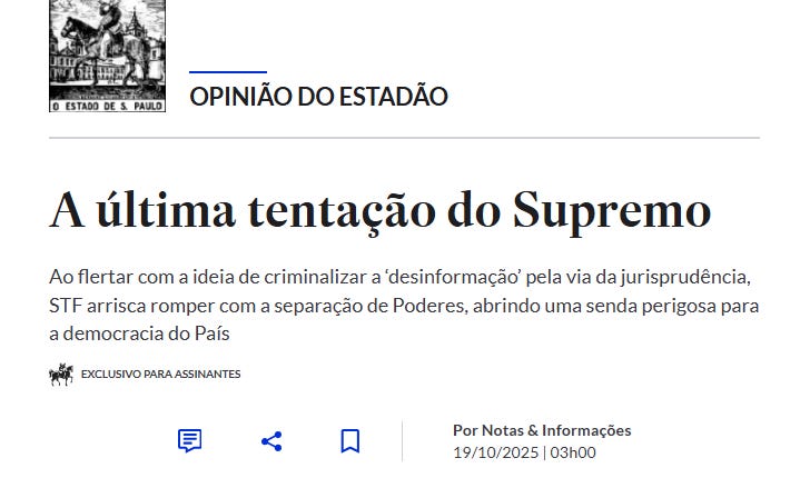 O editorial do Estadão anuncia “A última tentação do Supremo”. Ao julgar o chamado “núcleo da desinformação”, o STF estará diante da sua provação final.