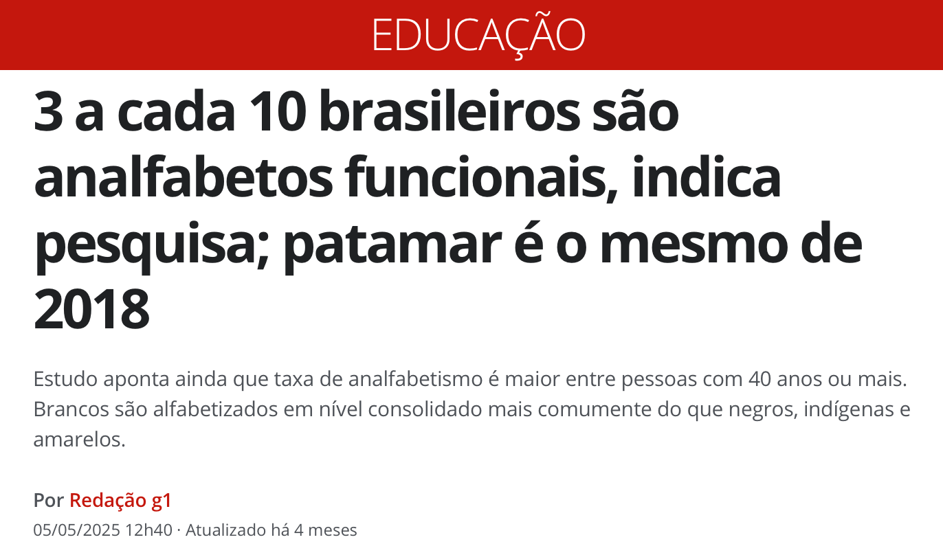 No Brasil, a taxa de analfabetismo funcional, quem não consegue compreender textos e realizar operações matemáticas básicas, é de 30%, segundo o Inaf de 2024.