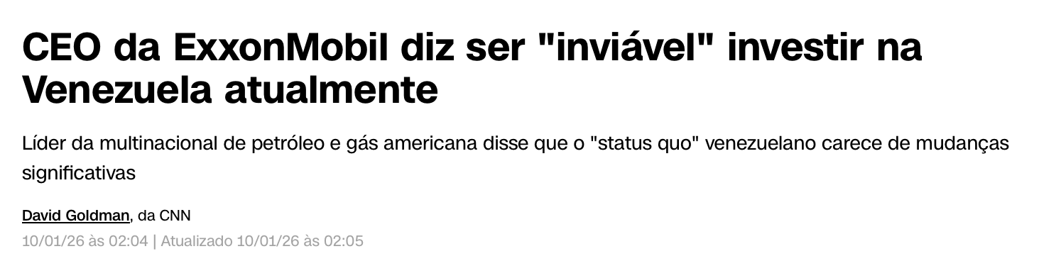 As grandes petroleiras internacionais condicionaram qualquer retorno consistente à Venezuela a garantias jurídicas, financeiras e políticas, segundo relataram jornais brasileiros, americanos e europeus. Em reunião recente com Donald Trump, executivos de empresas como ExxonMobil, Chevron e ConocoPhillips deixaram claro que o país, apesar de deter as maiores reservas de petróleo do mundo, segue sendo visto como um ambiente de alto risco para investimentos de longo prazo.